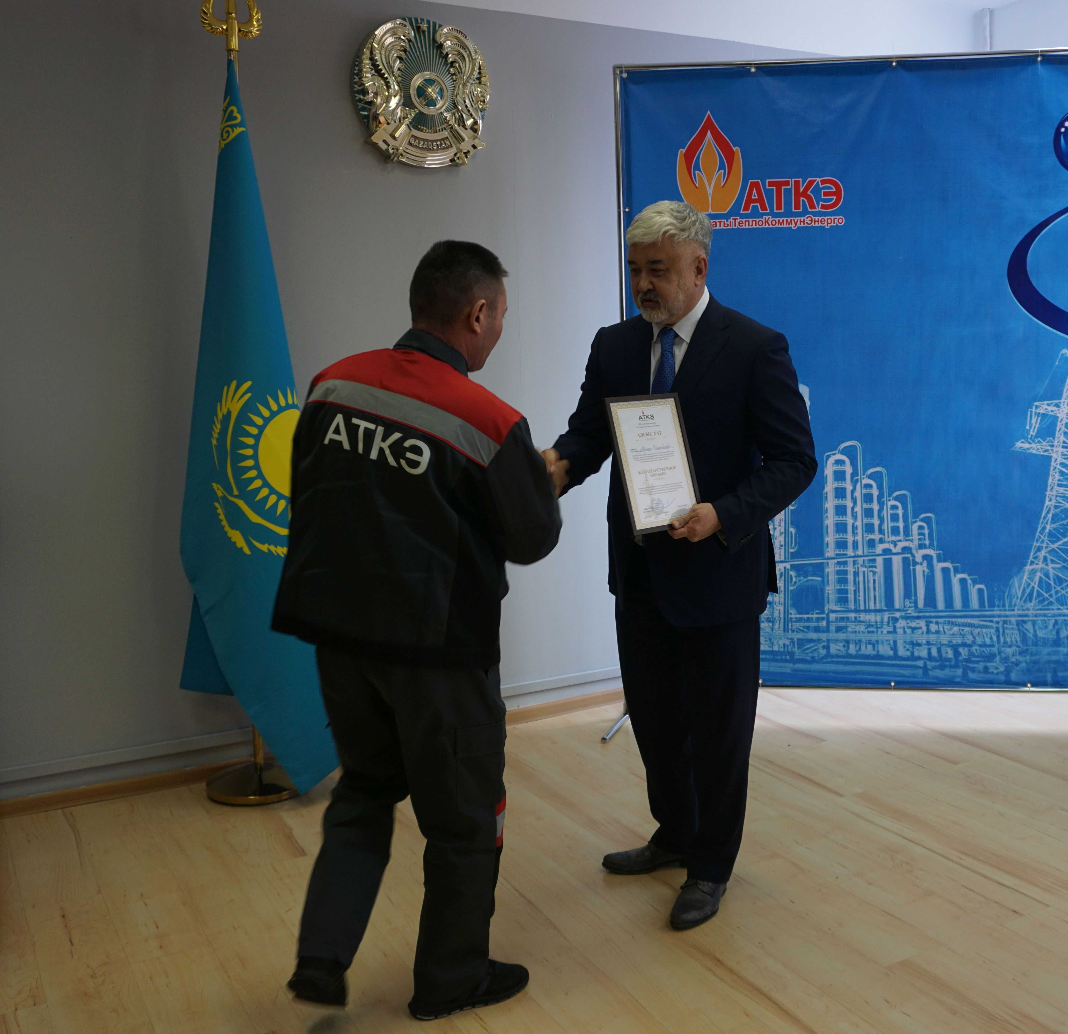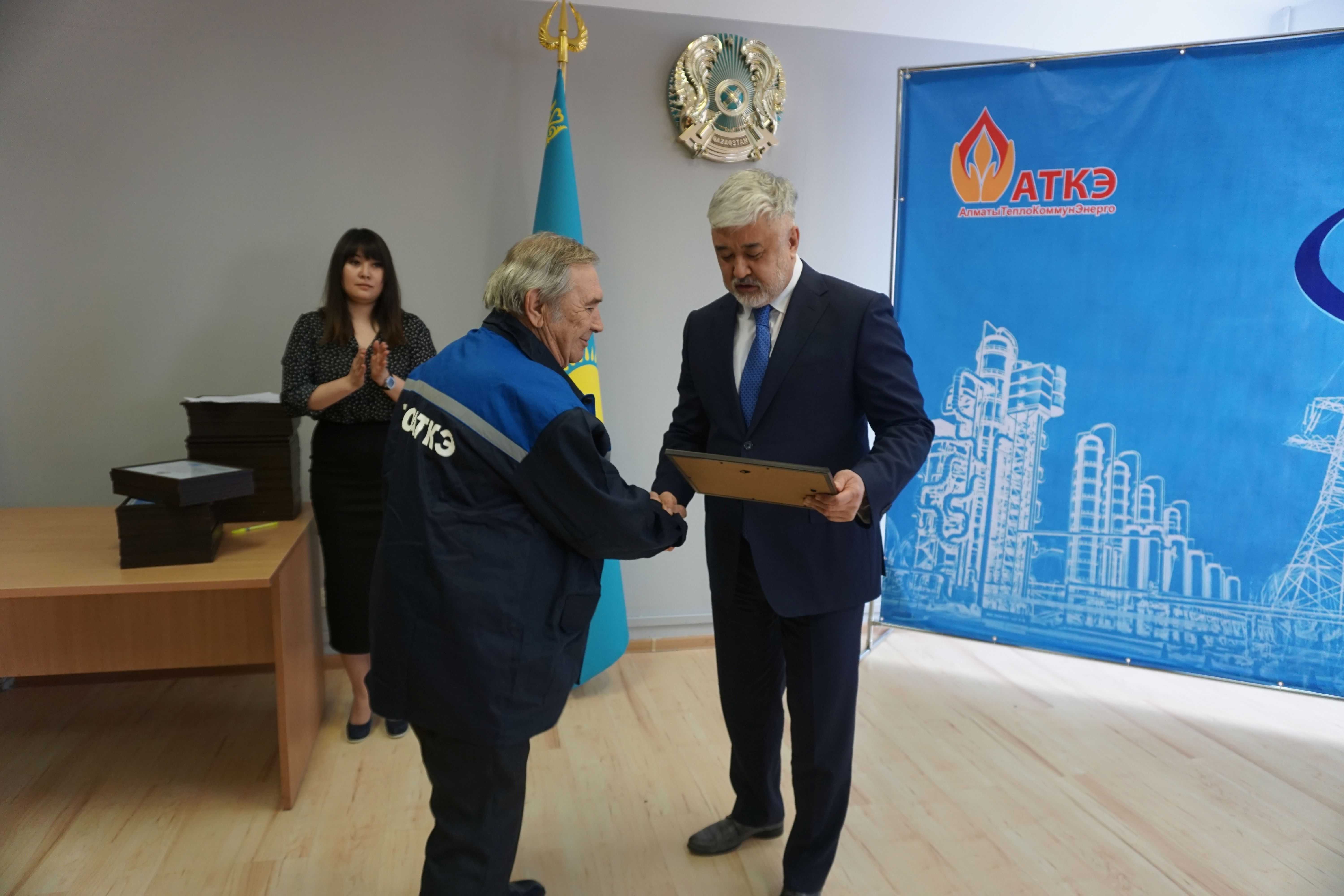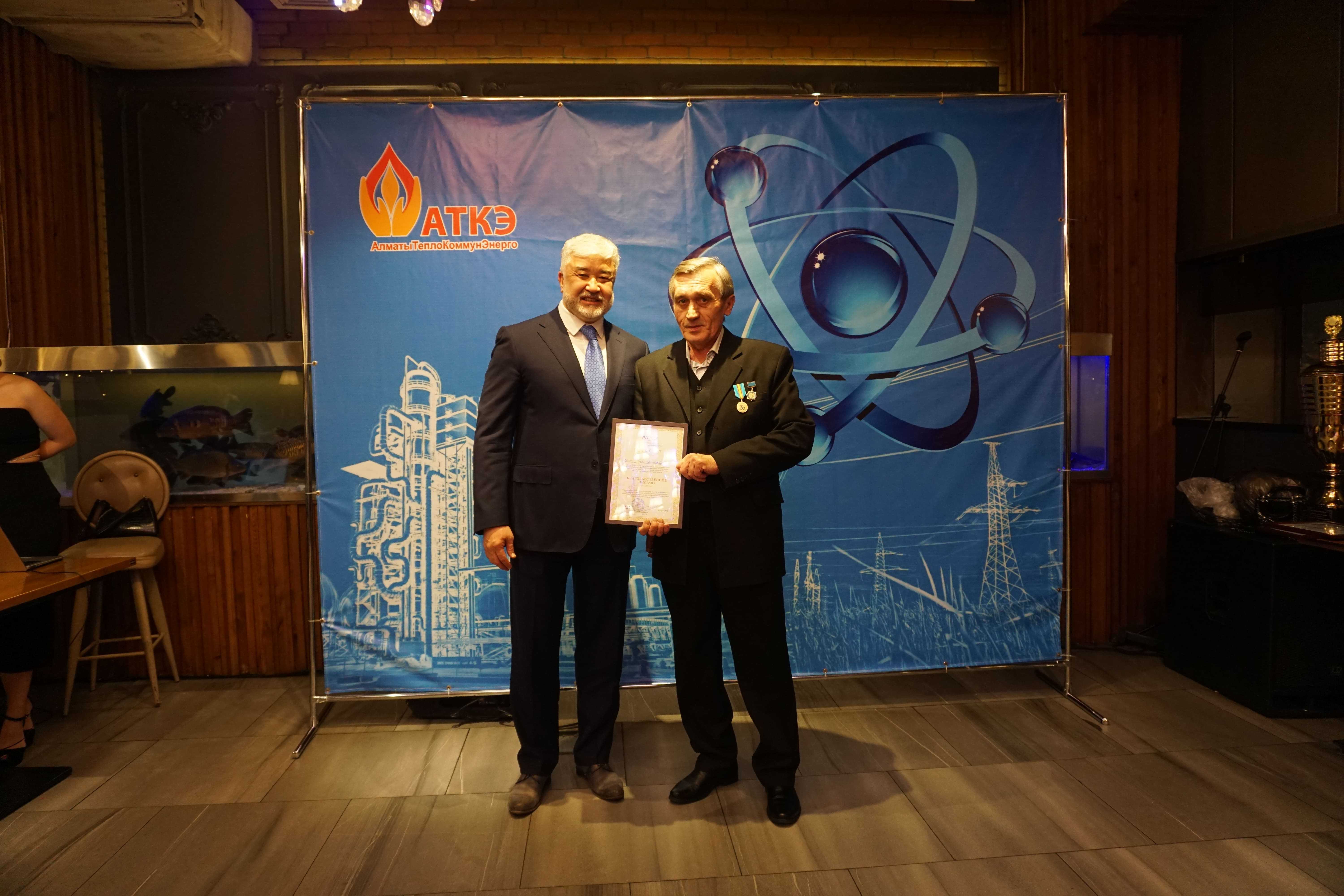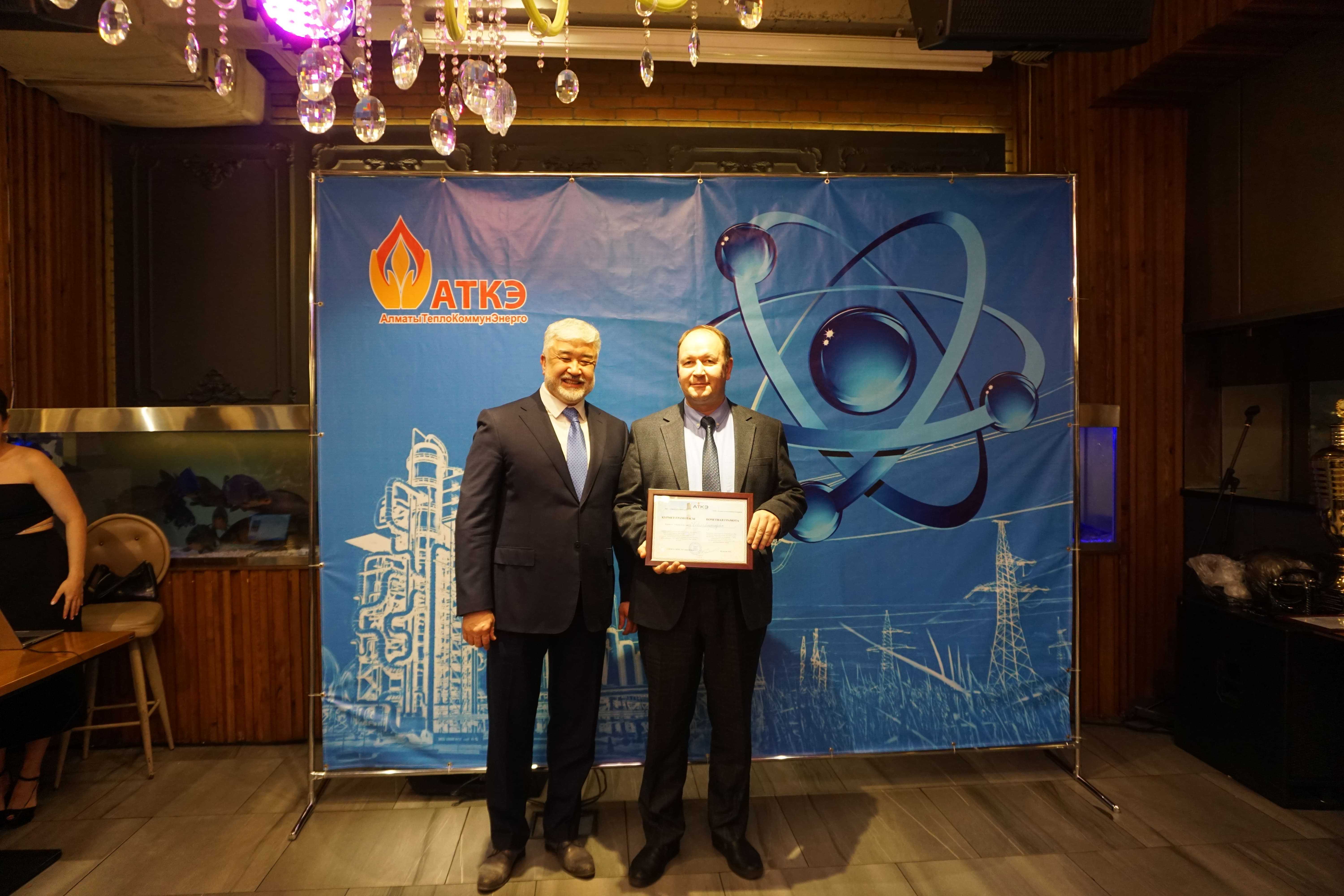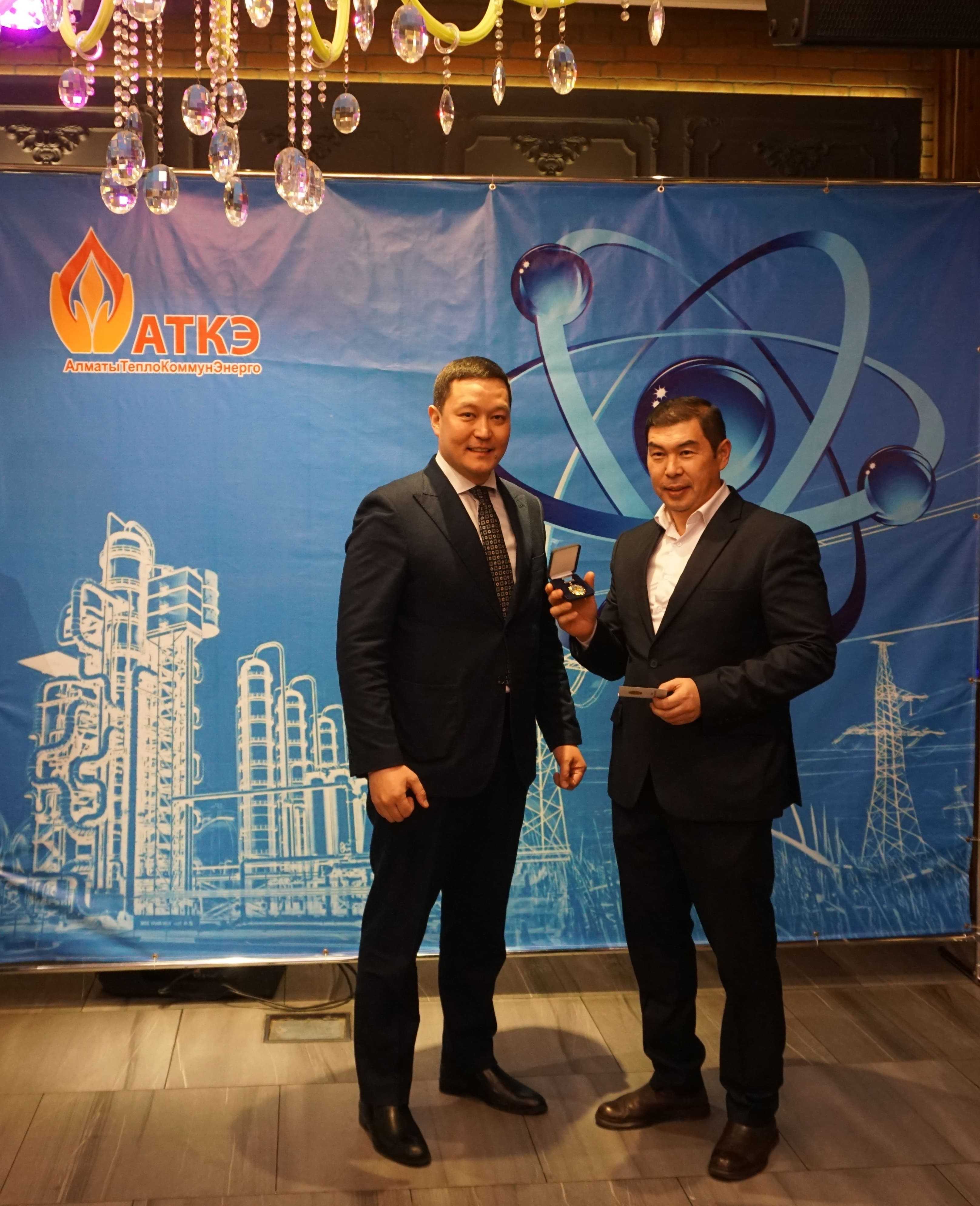 На церемонии были вручены нагрудные знаки РК от Министерства энергетики «Еңбек сіңірген энергетик», «Құрметті энергетик», почетные грамоты и благодарственные письма от акимата города Алматы , КГУ «Управления энергетики и водоснабжения г. Алматы» и ТОО “Алматытеплокоммунэнерго”. Поздравили и наградили сотрудников за высокое профессиональное мастерство и личный вклад в развитие предприятия руководитель управления энергетики и водоснабжения города Алматы -Алин С.М. , генеральный директор ТОО “АТКЭ”- Жунусов М.С. , главный инженер ТОО “АТКЭ” - Дюсенов С.О., заместитель генерального директора по экономике и финансам ТОО “АТКЭ” - Иппергенов Т.С., заместитель генерального директора по обеспечению производства ТОО “АТКЭ” - Нугарбеков Д.К., Заместитель главного инженера ТОО “АТКЭ” - Леденцов П.А.
