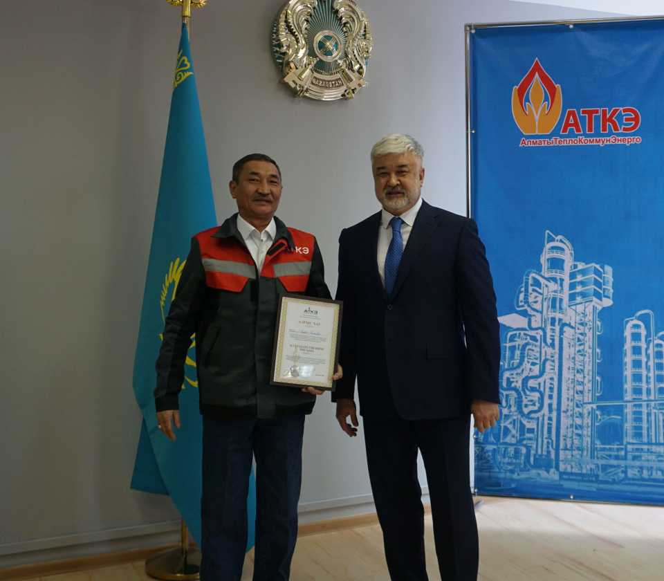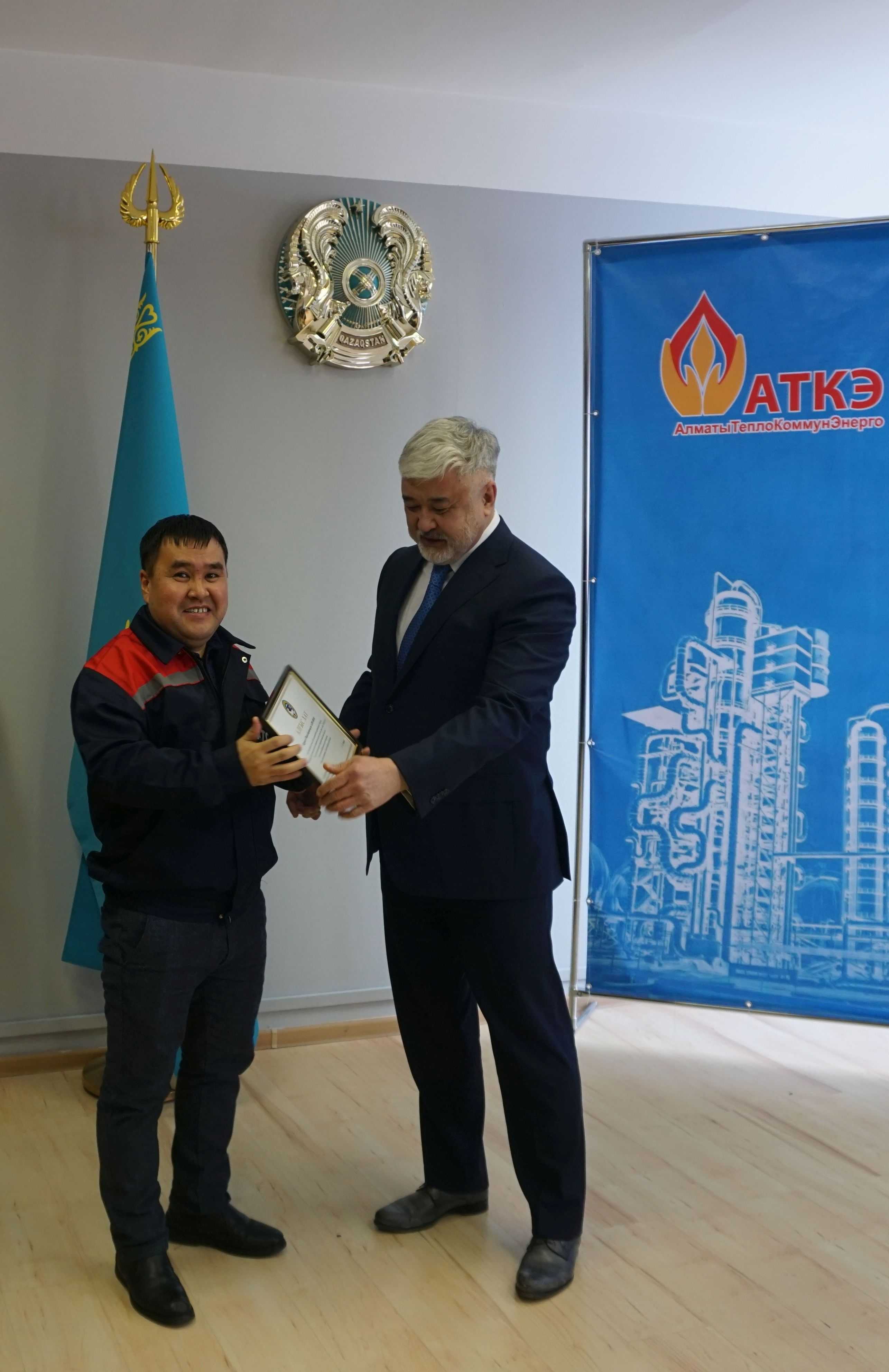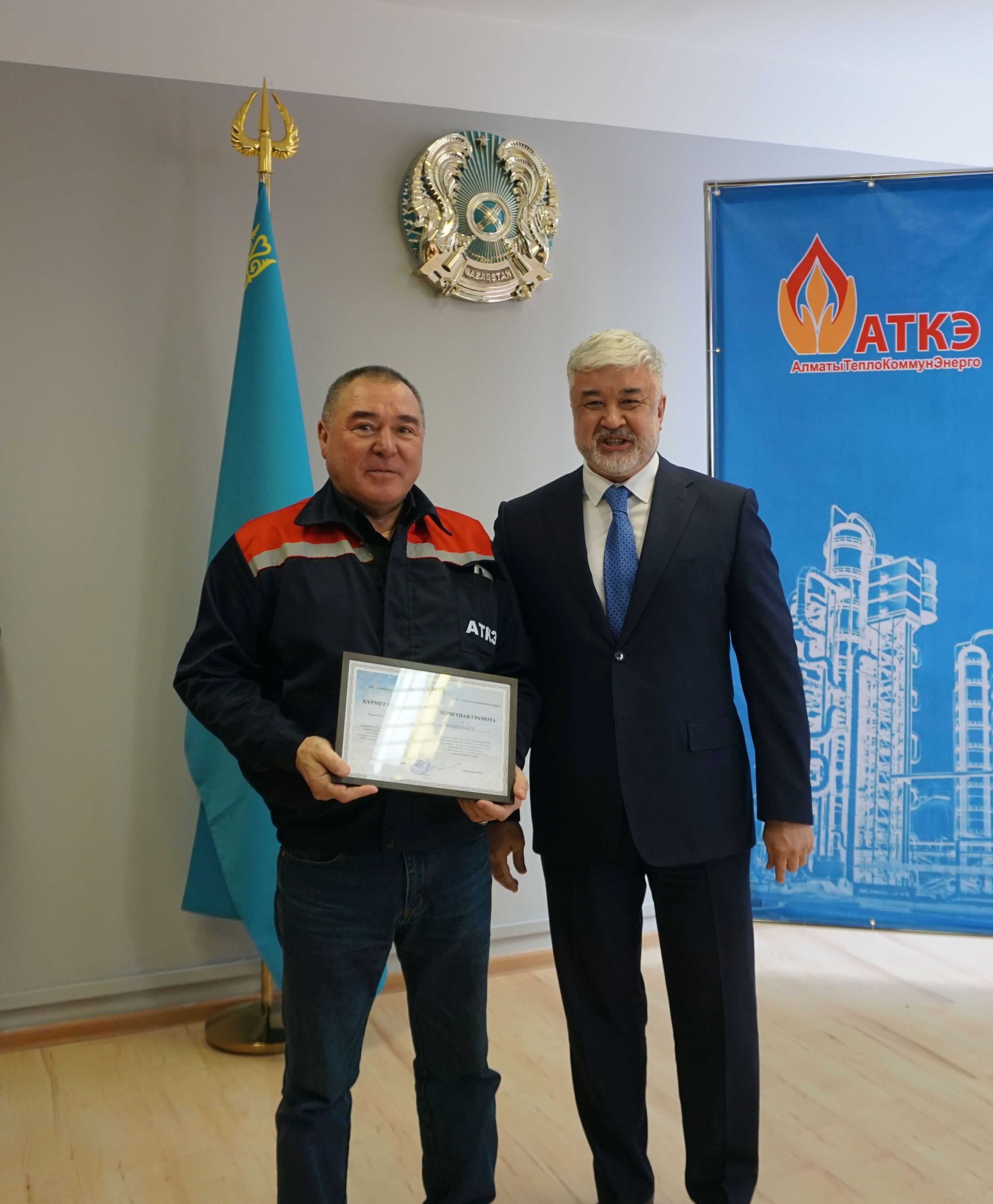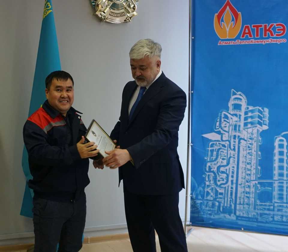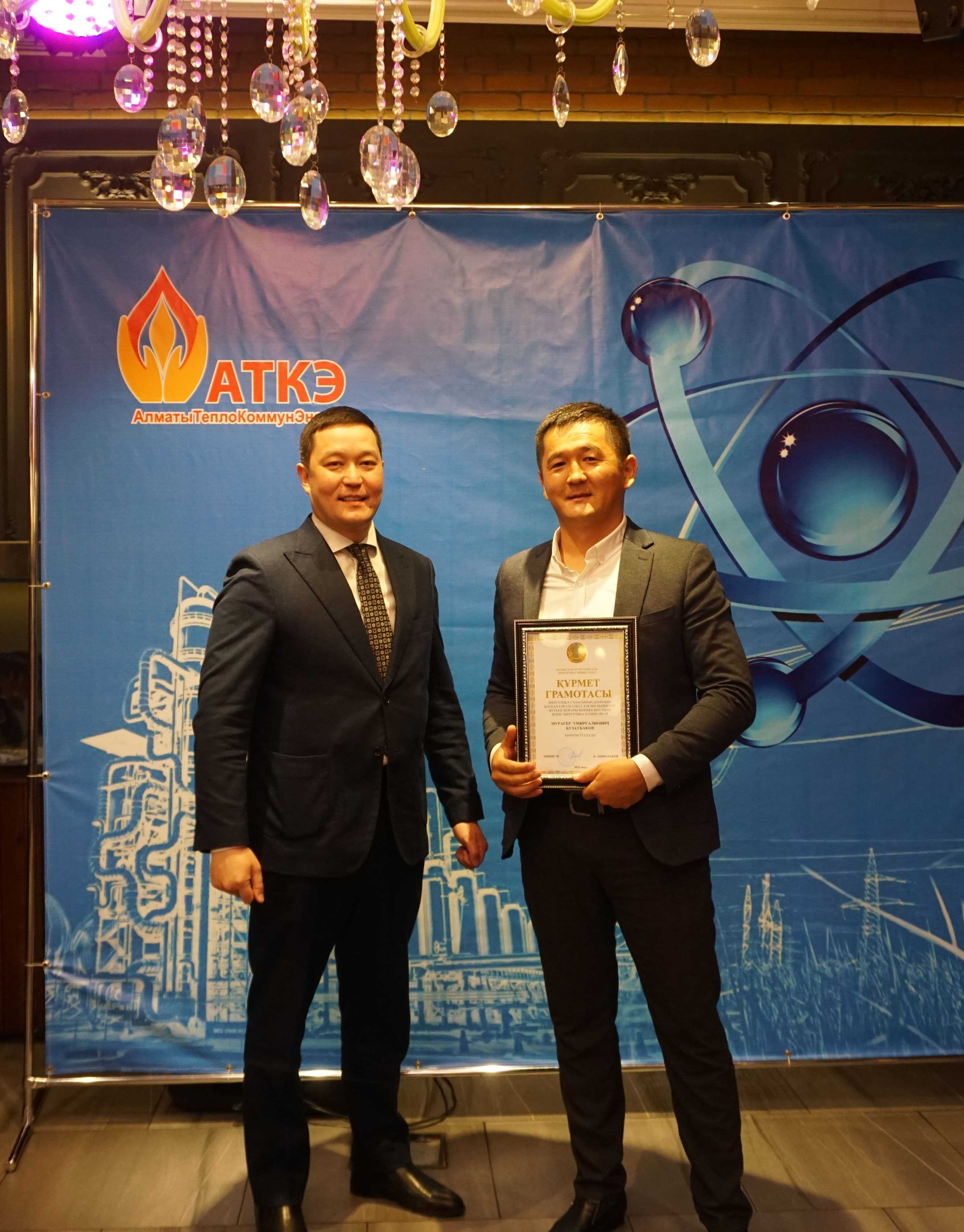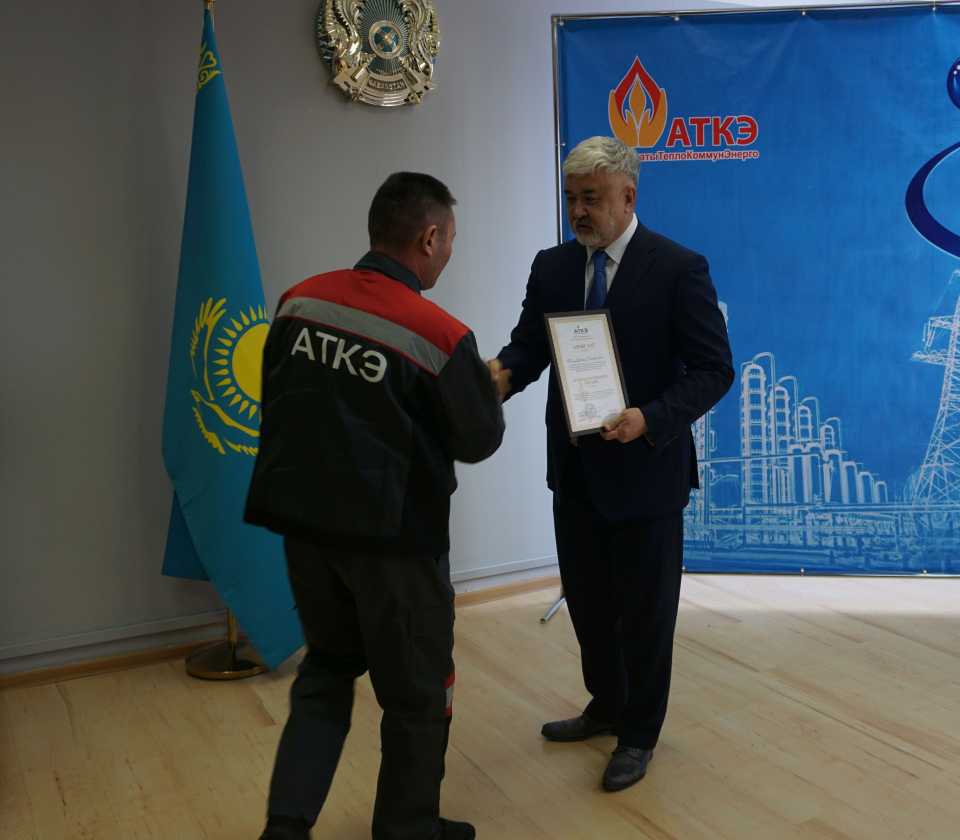 На церемонии были вручены нагрудные знаки РК от Министерства энергетики «Еңбек сіңірген энергетик», «Құрметті энергетик», почетные грамоты и благодарственные письма от акимата города Алматы , КГУ «Управления энергетики и водоснабжения г. Алматы» и ТОО “Алматытеплокоммунэнерго”. Поздравили и наградили сотрудников за высокое профессиональное мастерство и личный вклад в развитие предприятия руководитель управления энергетики и водоснабжения города Алматы -Алин С.М. , генеральный директор ТОО “АТКЭ”- Жунусов М.С. , главный инженер ТОО “АТКЭ” - Дюсенов С.О., заместитель генерального директора по экономике и финансам ТОО “АТКЭ” - Иппергенов Т.С., заместитель генерального директора по обеспечению производства ТОО “АТКЭ” - Нугарбеков Д.К., Заместитель главного инженера ТОО “АТКЭ” - Леденцов П.А.