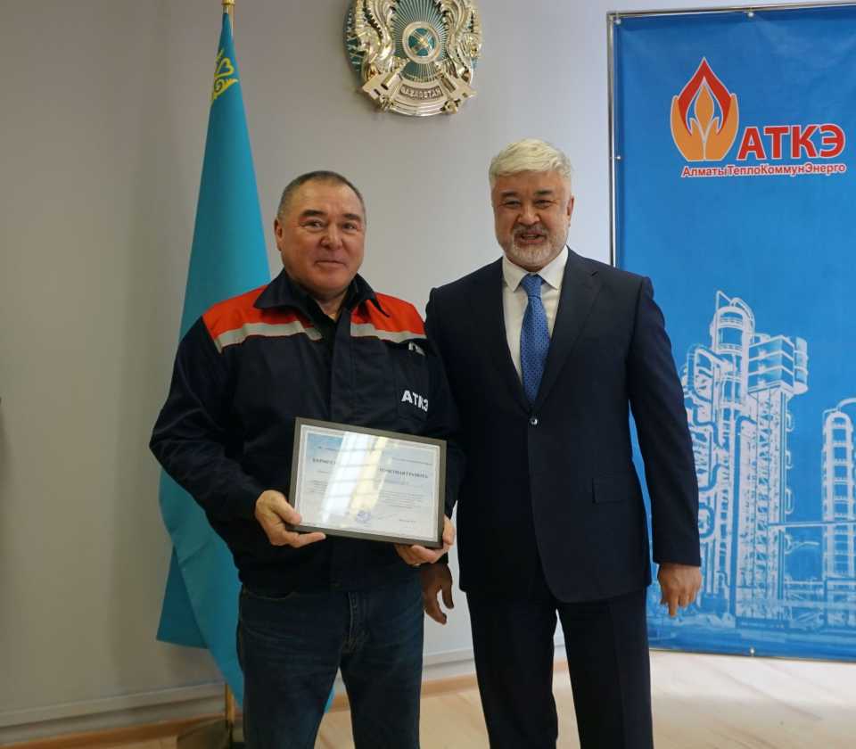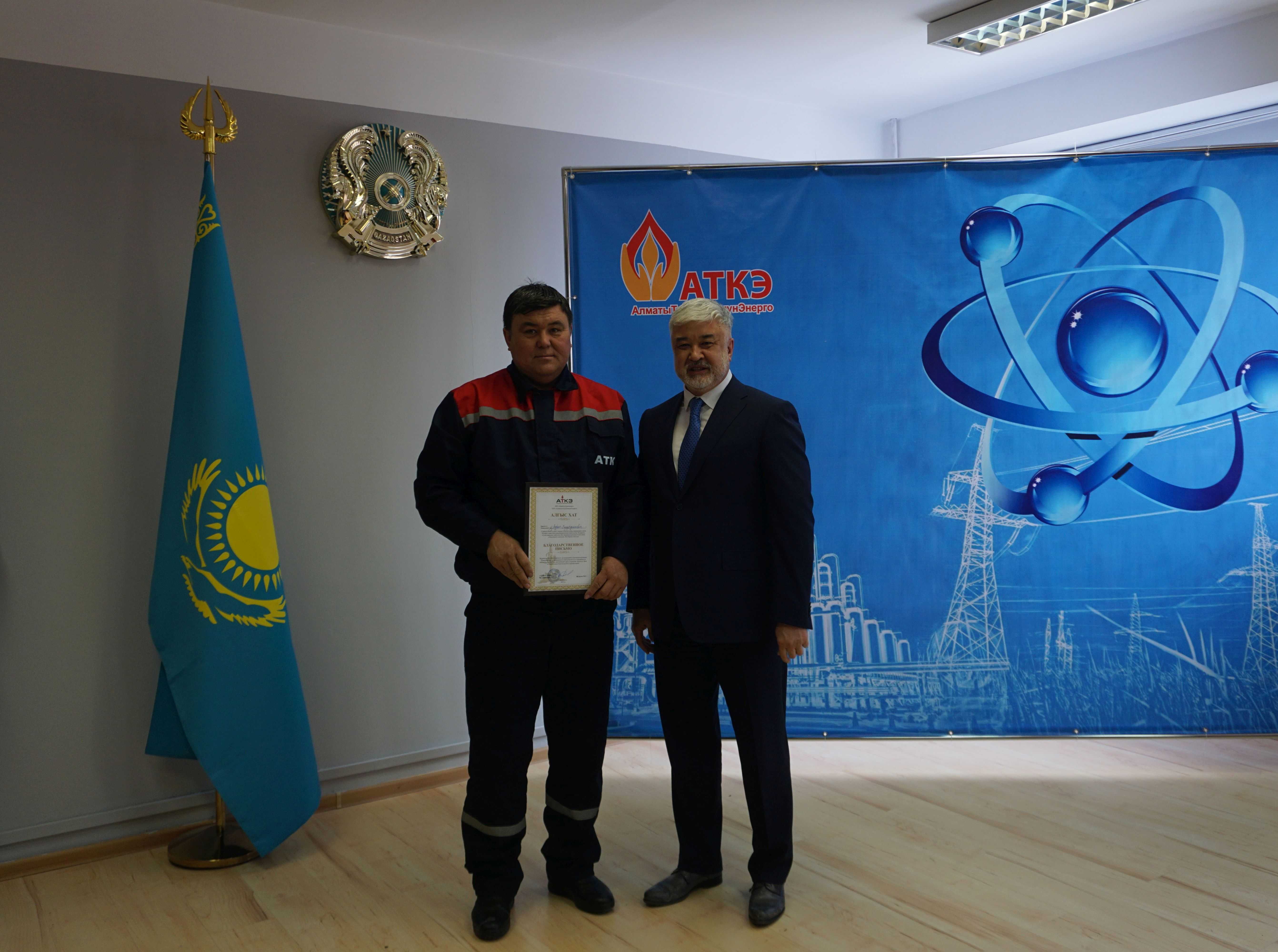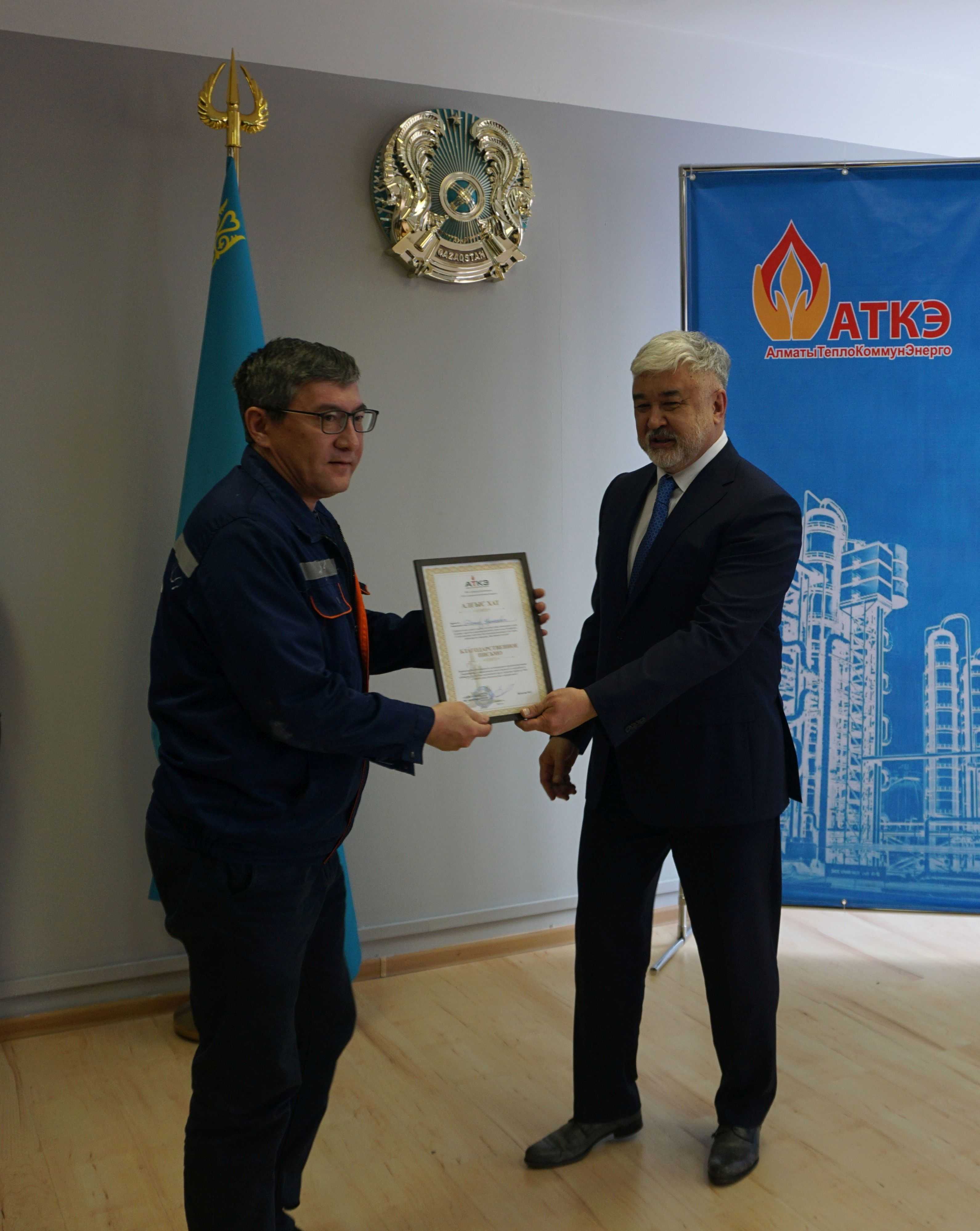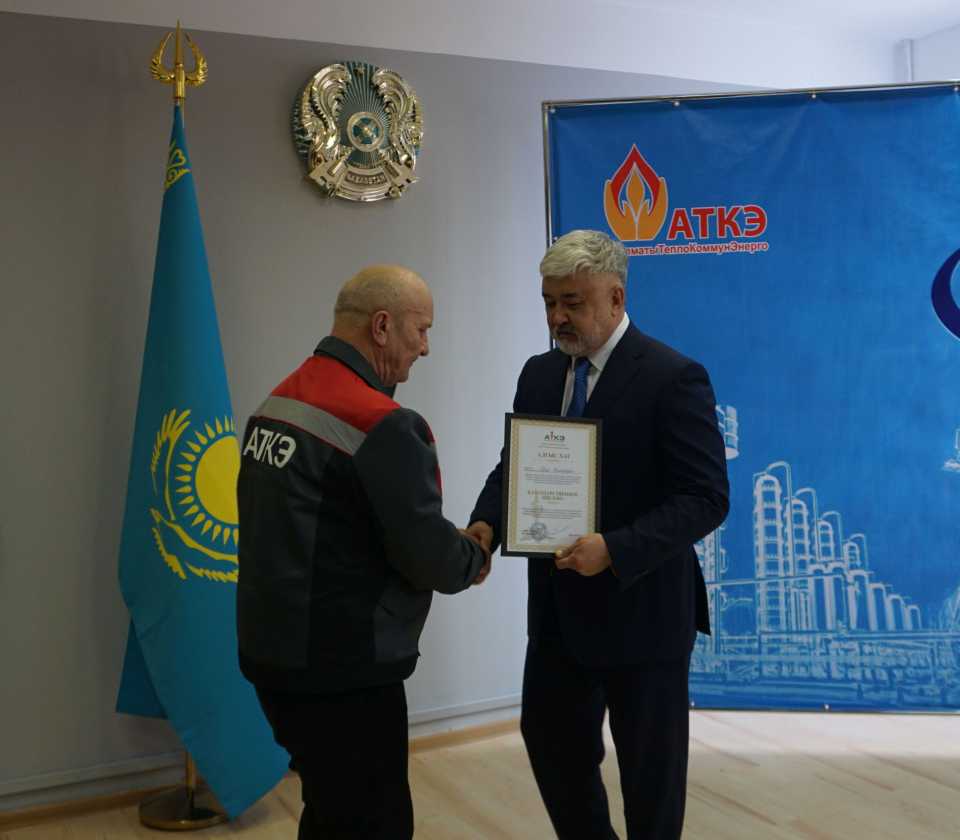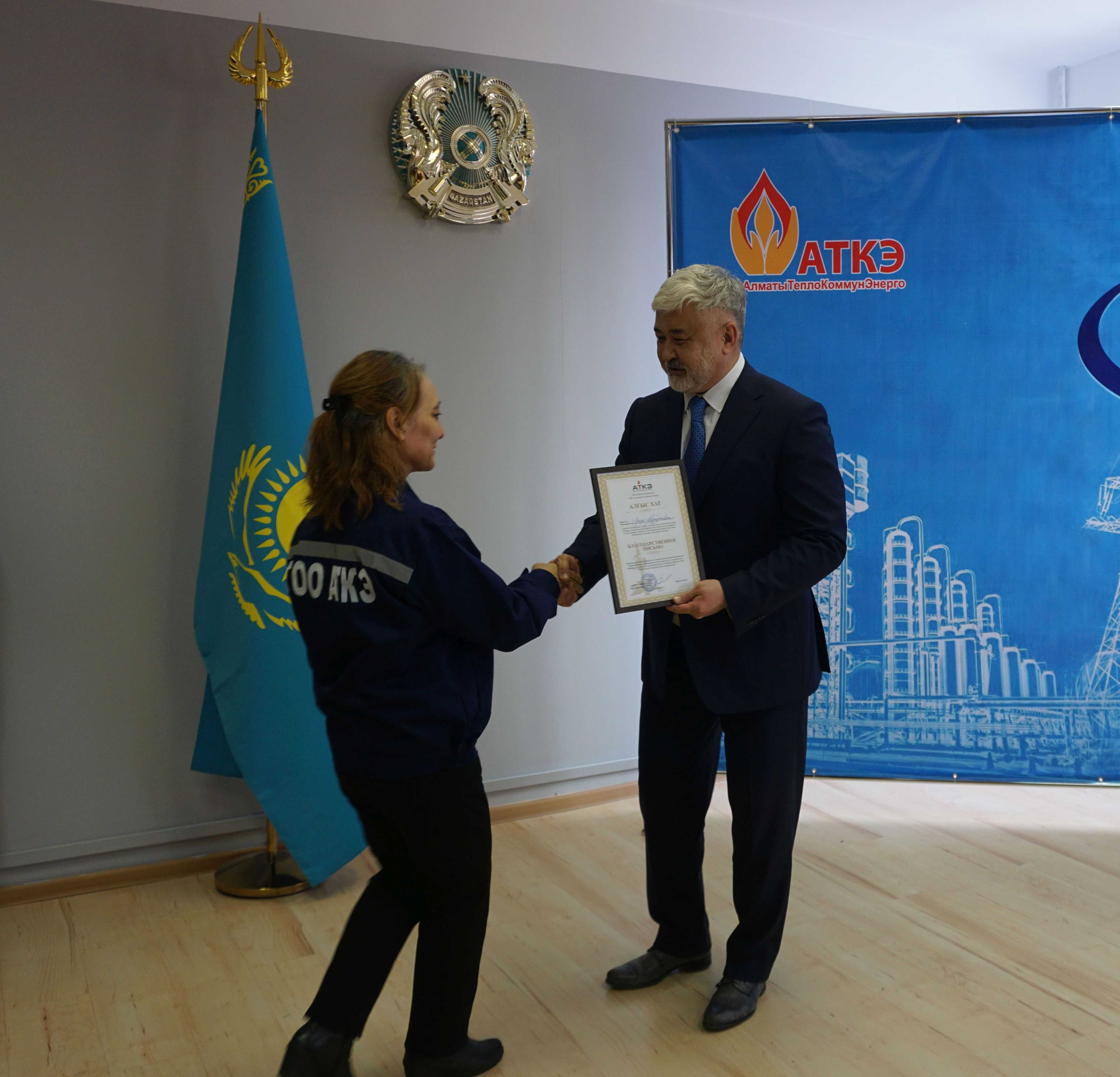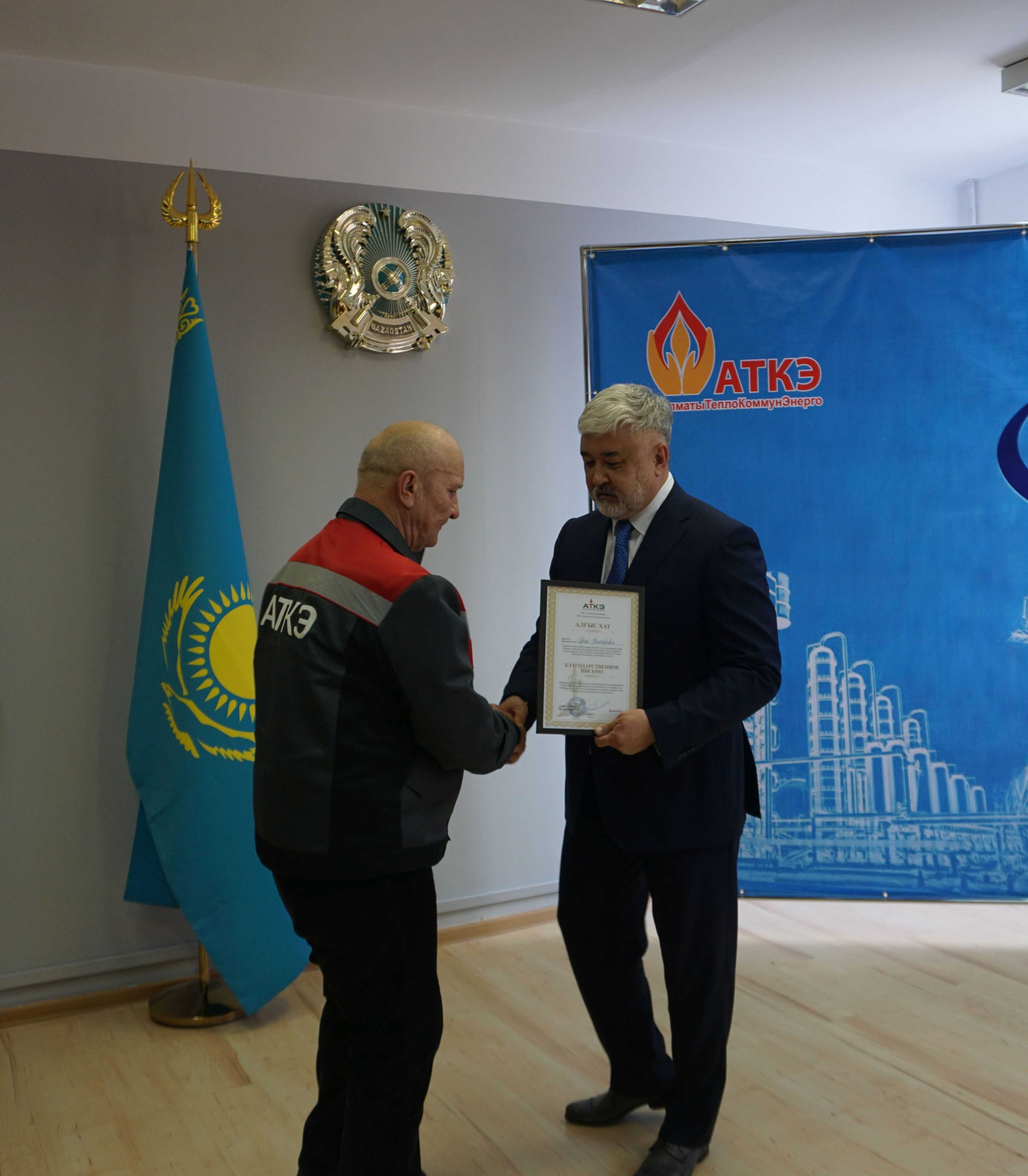На церемонии были вручены нагрудные знаки РК от Министерства энергетики «Еңбек сіңірген энергетик», «Құрметті энергетик», почетные грамоты и благодарственные письма от акимата города Алматы , КГУ «Управления энергетики и водоснабжения г. Алматы» и ТОО “Алматытеплокоммунэнерго”. Поздравили и наградили сотрудников за высокое профессиональное мастерство и личный вклад в развитие предприятия руководитель управления энергетики и водоснабжения города Алматы -Алин С.М. , генеральный директор ТОО “АТКЭ”- Жунусов М.С. , главный инженер ТОО “АТКЭ” - Дюсенов С.О., заместитель генерального директора по экономике и финансам ТОО “АТКЭ” - Иппергенов Т.С., заместитель генерального директора по обеспечению производства ТОО “АТКЭ” - Нугарбеков Д.К., Заместитель главного инженера ТОО “АТКЭ” - Леденцов П.А.