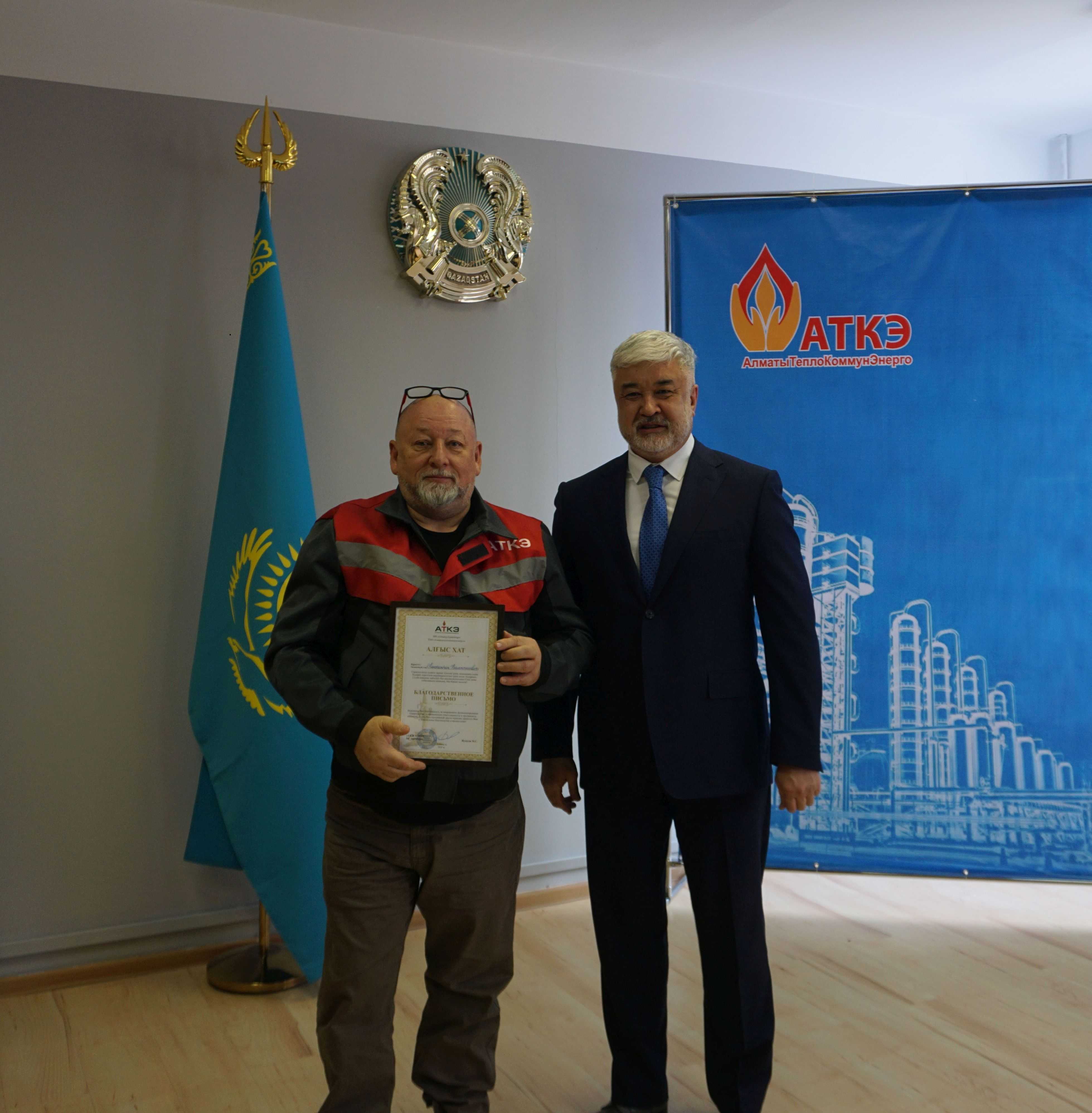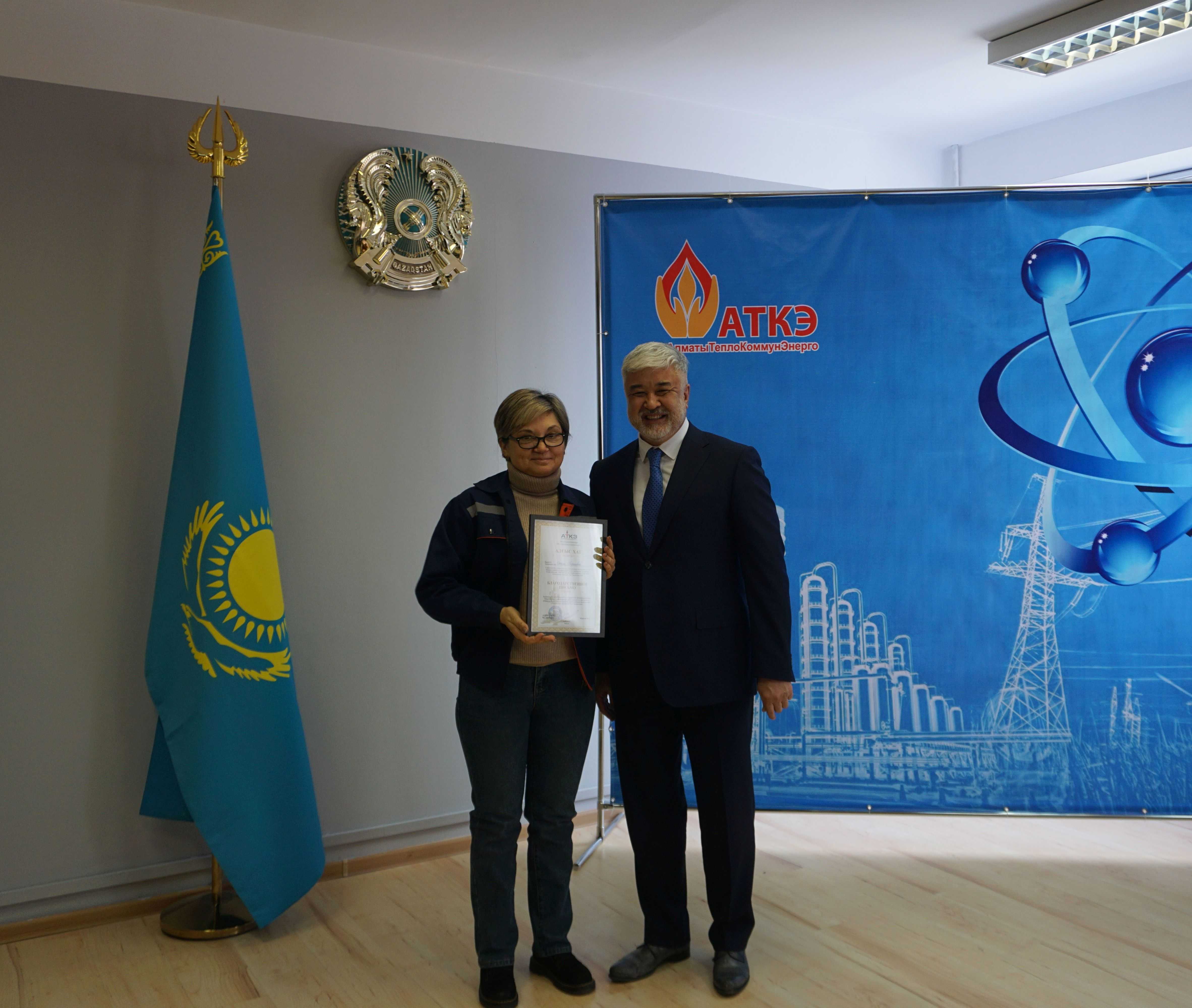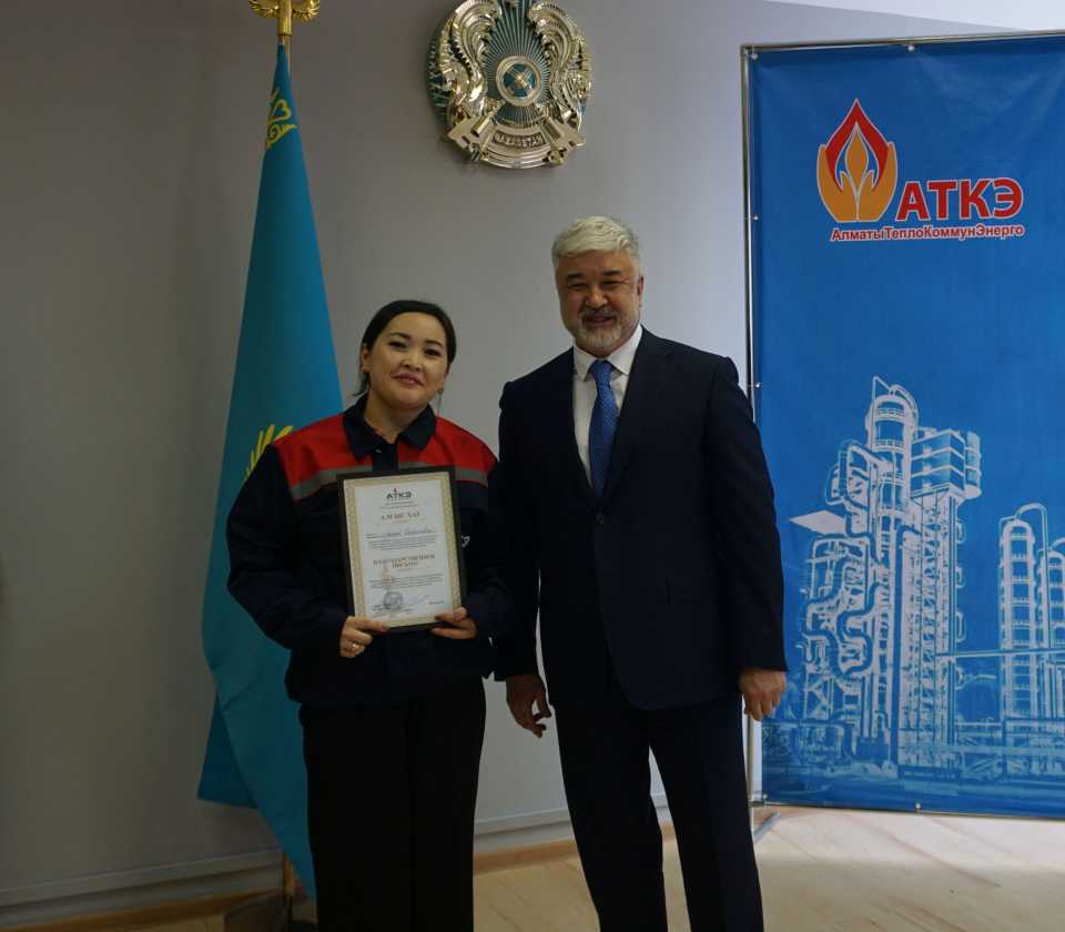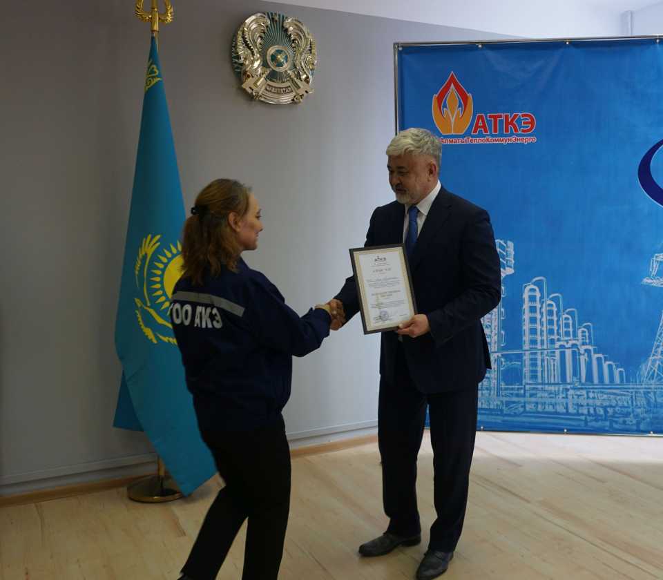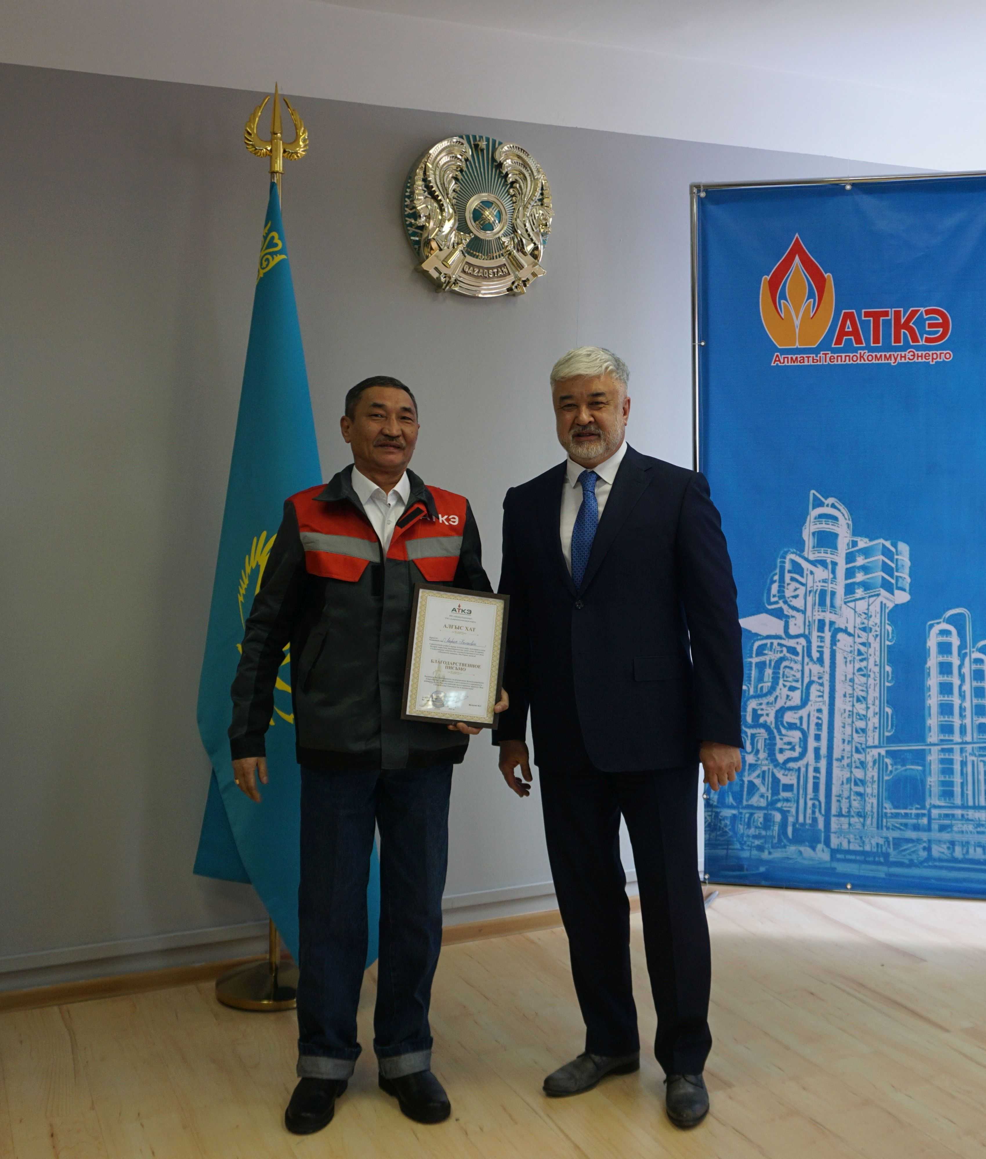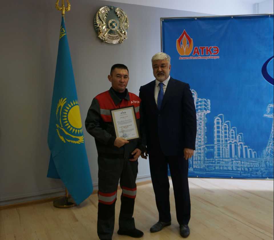 На церемонии были вручены нагрудные знаки РК от Министерства энергетики «Еңбек сіңірген энергетик», «Құрметті энергетик», почетные грамоты и благодарственные письма от акимата города Алматы , КГУ «Управления энергетики и водоснабжения г. Алматы» и ТОО “Алматытеплокоммунэнерго”. Поздравили и наградили сотрудников за высокое профессиональное мастерство и личный вклад в развитие предприятия руководитель управления энергетики и водоснабжения города Алматы -Алин С.М. , генеральный директор ТОО “АТКЭ”- Жунусов М.С. , главный инженер ТОО “АТКЭ” - Дюсенов С.О., заместитель генерального директора по экономике и финансам ТОО “АТКЭ” - Иппергенов Т.С., заместитель генерального директора по обеспечению производства ТОО “АТКЭ” - Нугарбеков Д.К., Заместитель главного инженера ТОО “АТКЭ” - Леденцов П.А.