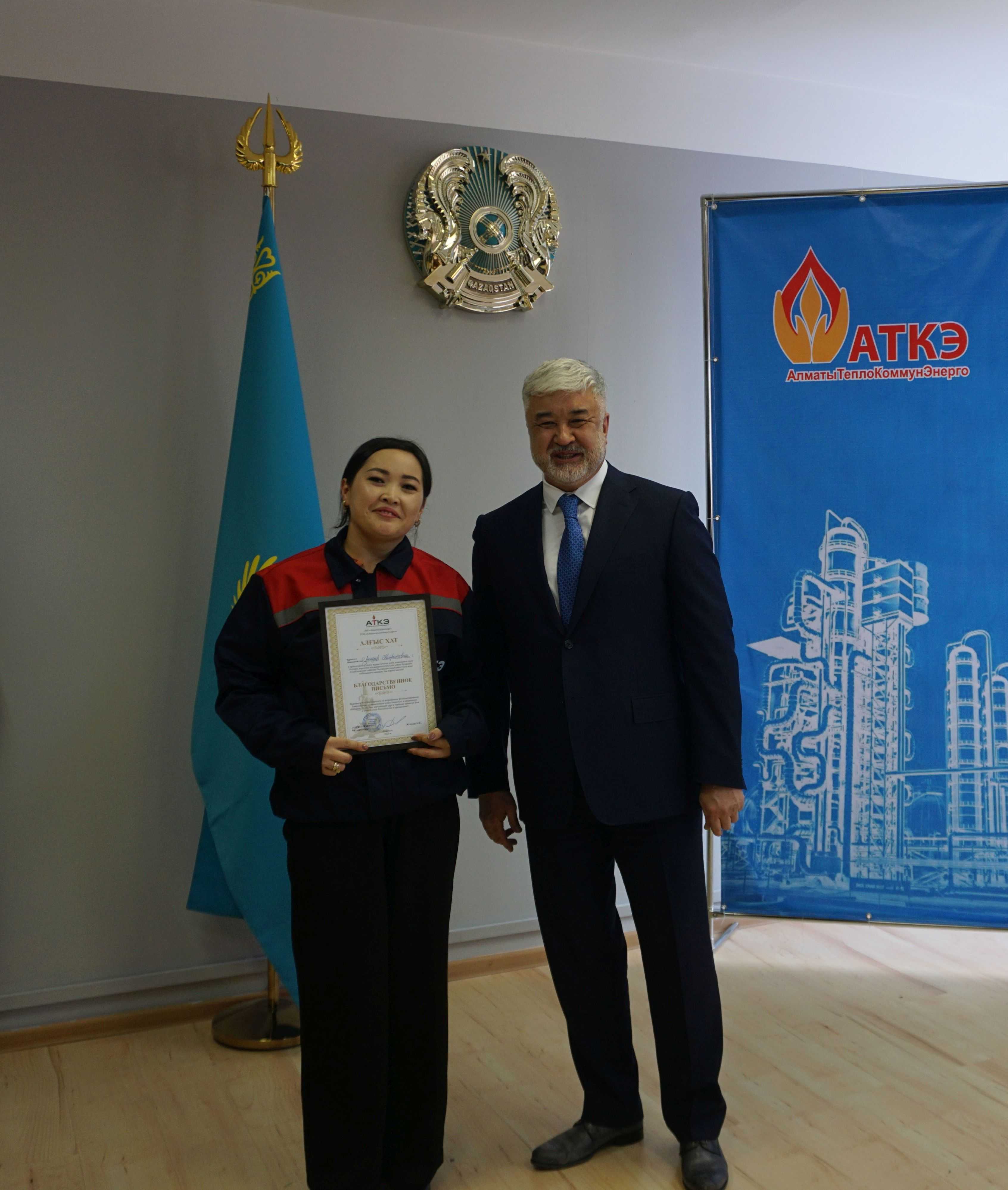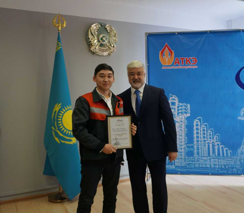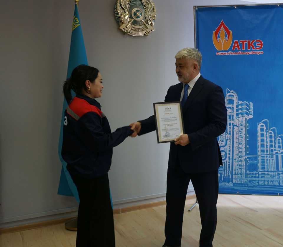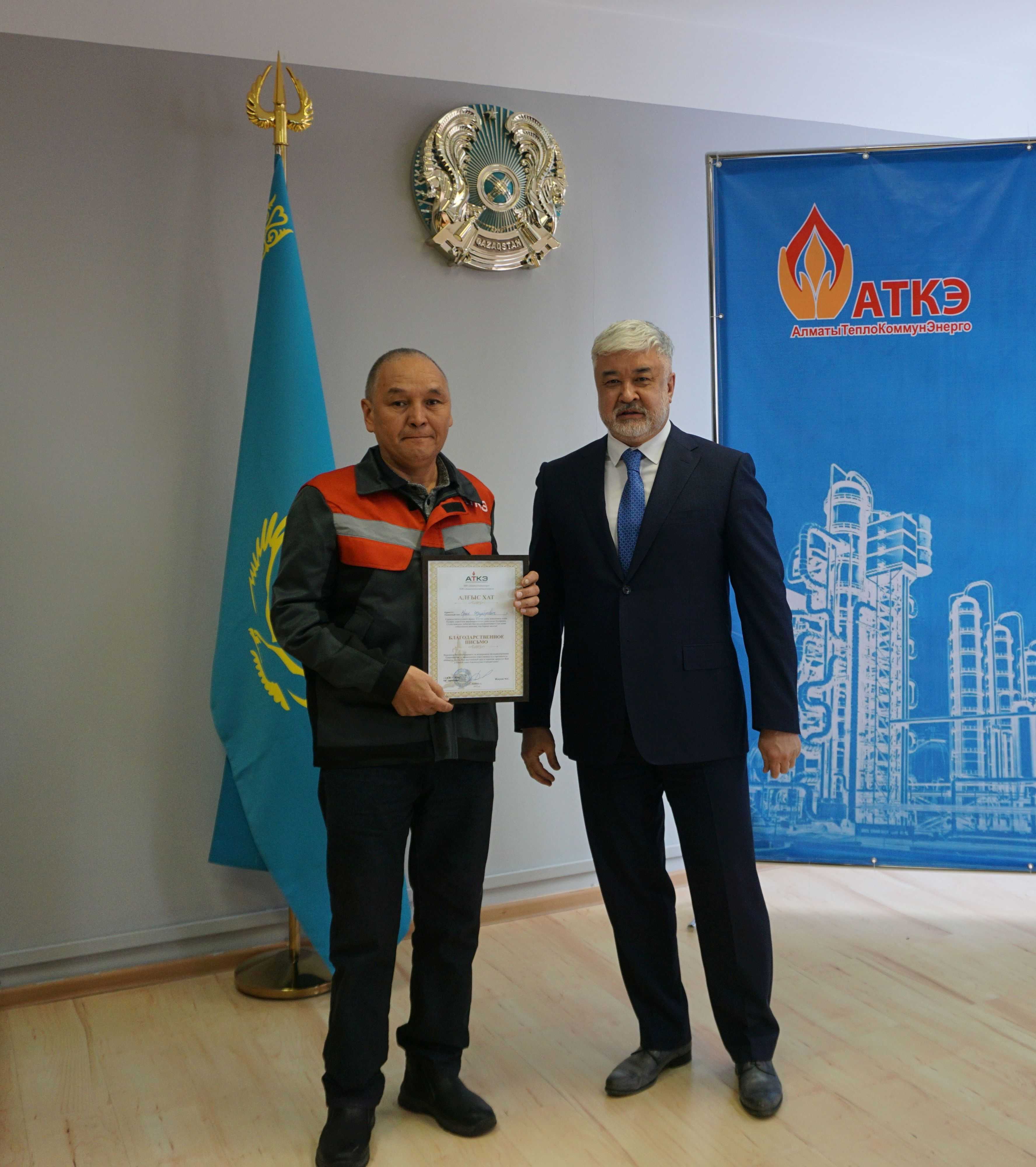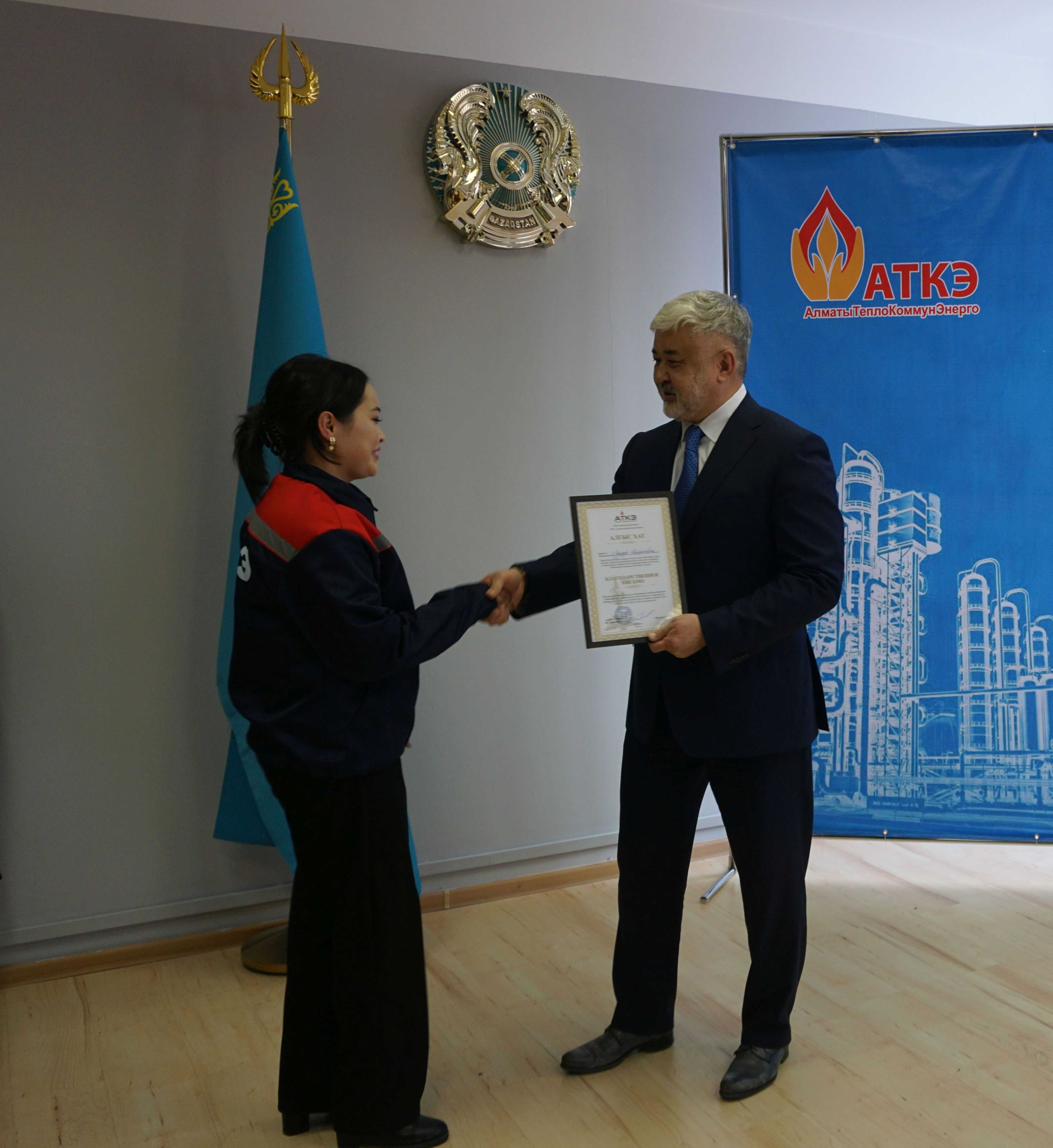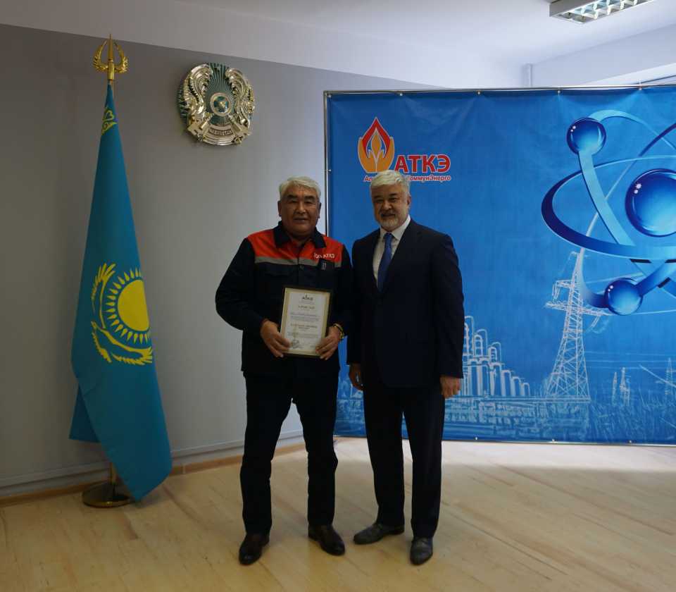 На церемонии были вручены нагрудные знаки РК от Министерства энергетики «Еңбек сіңірген энергетик», «Құрметті энергетик», почетные грамоты и благодарственные письма от акимата города Алматы , КГУ «Управления энергетики и водоснабжения г. Алматы» и ТОО “Алматытеплокоммунэнерго”. Поздравили и наградили сотрудников за высокое профессиональное мастерство и личный вклад в развитие предприятия руководитель управления энергетики и водоснабжения города Алматы -Алин С.М. , генеральный директор ТОО “АТКЭ”- Жунусов М.С. , главный инженер ТОО “АТКЭ” - Дюсенов С.О., заместитель генерального директора по экономике и финансам ТОО “АТКЭ” - Иппергенов Т.С., заместитель генерального директора по обеспечению производства ТОО “АТКЭ” - Нугарбеков Д.К., Заместитель главного инженера ТОО “АТКЭ” - Леденцов П.А.